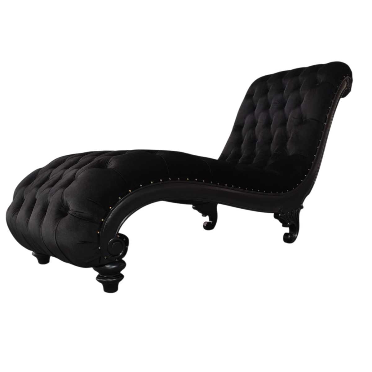 Morsana Chaise, a premium quality hand carved and fully buttoned luxury furniture piece. Made from hand carved Mahogany wood, this chaise features a unique curved design and rare Georgian-style back feet. Upholstered in high density foam and black velvet, with brass studs for added opulence.